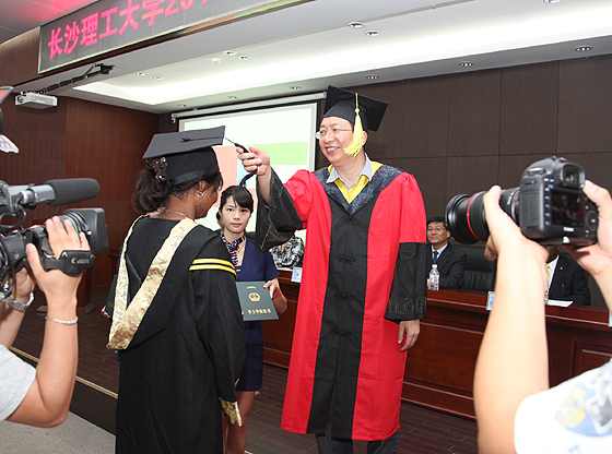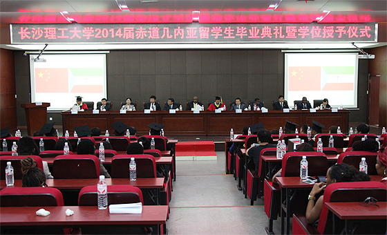 7月3日上午,云顶国际vip88662014届赤道几内亚留学生毕业典礼暨学位授予仪式在云塘校区国际学术交流中心隆重举行。赤道几内亚共和国公共工程及基础设施部长胡安·恩科·姆布拉、驻中国大使馆一秘辛弗里亚诺·埃拉·阿塞克·阿贝格、交通部国际司司长杨赞、湖南省外事侨务办副主任邱爱华、湖南省交通运输厅副巡视员徐建、中国交通建设股份有限公司总裁助理、中国路桥工程有限责任公司董事长文岗、中国交通建设股份有限公司海外事业部总经理陈重、云顶国际vip8866党委书记付宏渊、副校长杨伟军等出席典礼。云顶国际vip8866在校留学生和部分师生代表共200余人参加典礼。