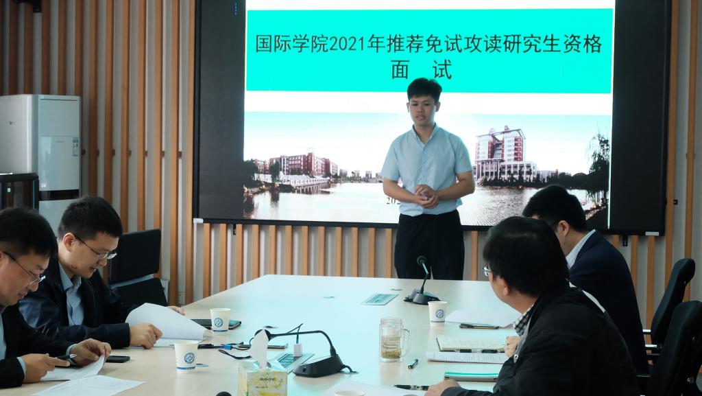 国际学院于2020年9月27日上午在新能源大楼一栋416会议室举行2021届优秀本科毕业生研究生推免面试答辩。在学生自我介绍、成绩汇报、专家提问等环节后,根据学校要求的思想政治品德、学业成绩和科研创新潜质与专业能力三个方面进行了综合考评,最后同意推荐丁山同学作为2021届普通类本科生免试攻读研究生候选人,易树德同学作为2021届“特殊学术专长人才专项”本科生免试攻读硕士学位研究生候选人并报学校审批。
