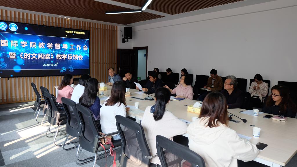1028日上午,国际学院在新能源大楼416会议室组织召开教学督导工作会议暨《时文阅读》教学反馈会,外国语学院副院长黄坚、国际学院督导组李学罡、任延杰、《时文阅读》授课教师罗丹宇、方达婧、国际学院党总支书记刘安生、院长陈瑜、副院长秦卫星、教务办及学工办全体老师参加,会议由陈瑜主持。
