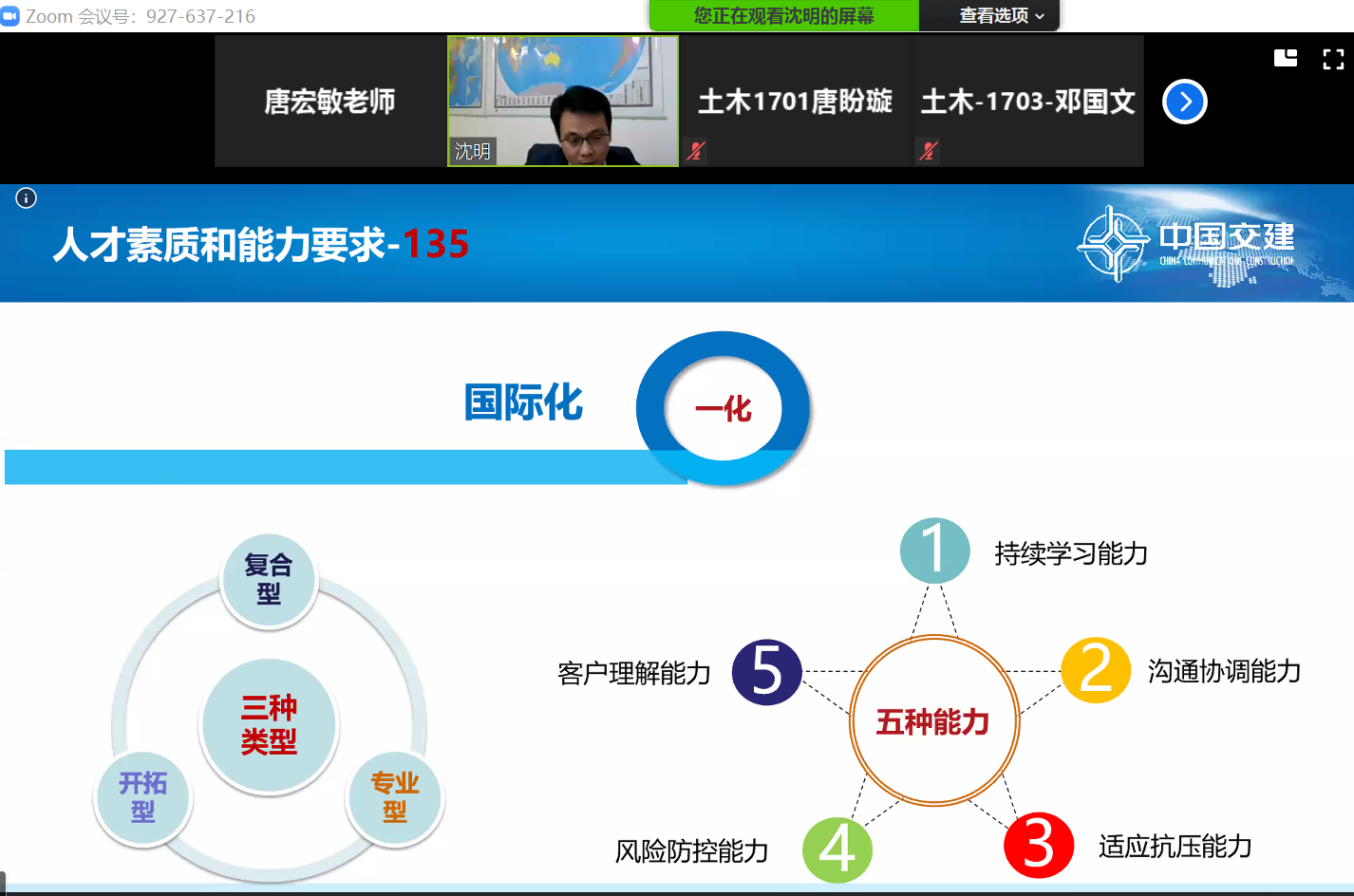 2月25日下午, 国际学院“与央企高管面对面——共话土木工程国际化”大学生职业发展与就业指导线上讲座通过视频软件平台成功举办。本次讲座邀请到中交一公局集团人力资源部副总经理、海外事业部人力中心主任沈明主讲。线上听讲人数达600余人。