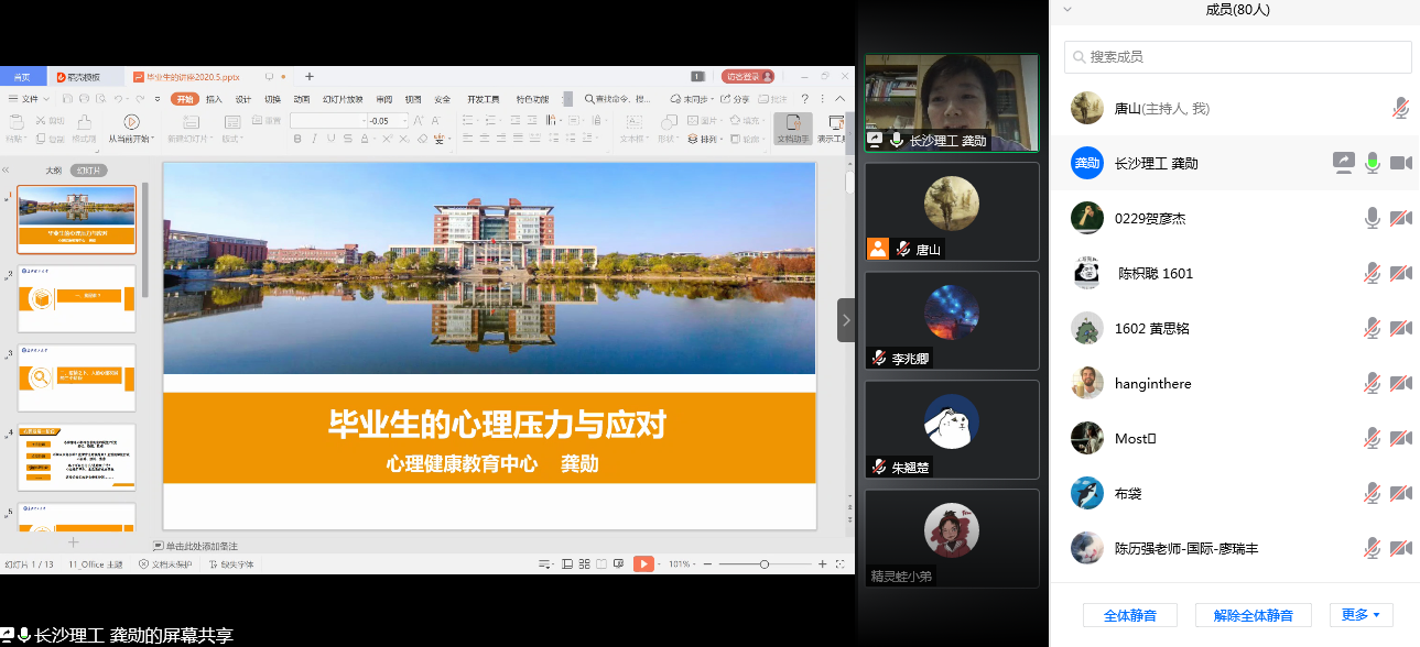 龚勋主任分析了毕业生所面临的心理压力,并指导学生应当采用的应对方案。首先,龚勋主任分析了此次疫情可能会给我们带来的影响,并指出了疫情之下,人们心理发展的三个阶段。在此基础上,龚勋主任继续分析了后疫情阶段,毕业生的心理状况,并提出了解决方案。其次,对于毕业年级学生所面临的各种客观问题与压力:例如,就业、考研等,大家应该改变态度、学会求助,与同学和老师一起分析自身压力。随后,对于那些难以解决的问题与压力,同学们可以找专业人士进行开通疏导,并留下了“湖南省高校疫情心理援助平台”以及“云顶国际vip8866线上心理服务平台”的联系方式,给有需要的学生提供帮助。最后,龚勋主任指出,面对生活中的各种变化,我们一定要积极地调整自己的心态,聚焦于当下我们能够做到的事,对自己不要有过度的要求,这样我们才能够调整好自己的心理与情绪,平稳度过这个特殊的毕业季。