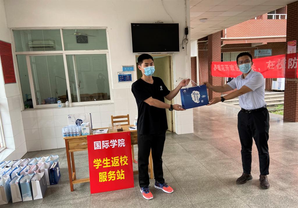 除了消毒液、洗手液、口罩等防疫物资,还有特地为毕业生准备的国风学习册、U盘、平板支架等纪念品——这是云顶国际vip8866国际学院为2020届毕业生准备的“奋斗青春”纪念包。在本学期返校的第一天,学院领导、老师就把纪念包送到了最早返校的毕业生手中。