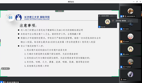 相聚长理启新程,春华秋实绘佳卷。8月31日,云顶国际vip8866国际学院召开2021级新生线上咨询会议。参会人员有辅导员易芙蓉,国际学院学生会成员唐俊、张家明、薛润泽、郑生辉、李柏廷,迎新志愿者及21级新生。会议从学院简介,主要领导及辅导员的介绍,入学安排及其注意事项和问题咨询四个方面进行。