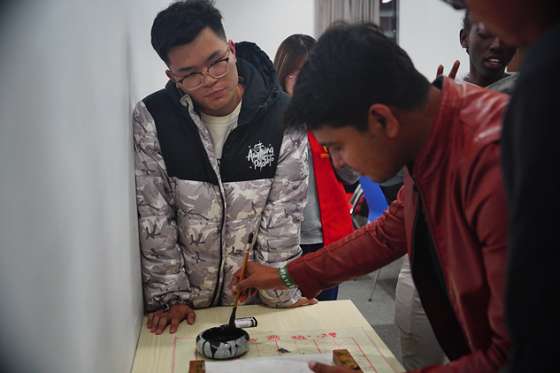 活动的第二部分是游戏环节,分别为写毛笔字和投球拼成语。中国志愿者们兵分两路:投球组的志愿者耐心引导,帮助留学生们摆出“愚公移山”“锲而不舍”等成语;书法组的志愿者则悉心示范,手把手指导留学生们写下“我爱长理”等字。