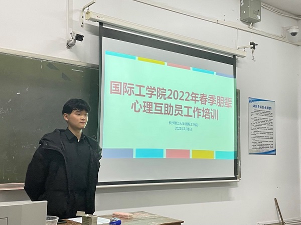 2022年3月2日19点,国际工学院在金盆岭校区12教110教室召开了2022年春季2021级朋辈心理互助员工作培训。国际工学院辅导员魏涛、学生会心理部成员、2021级全体心理委员参加了此次培训会议。