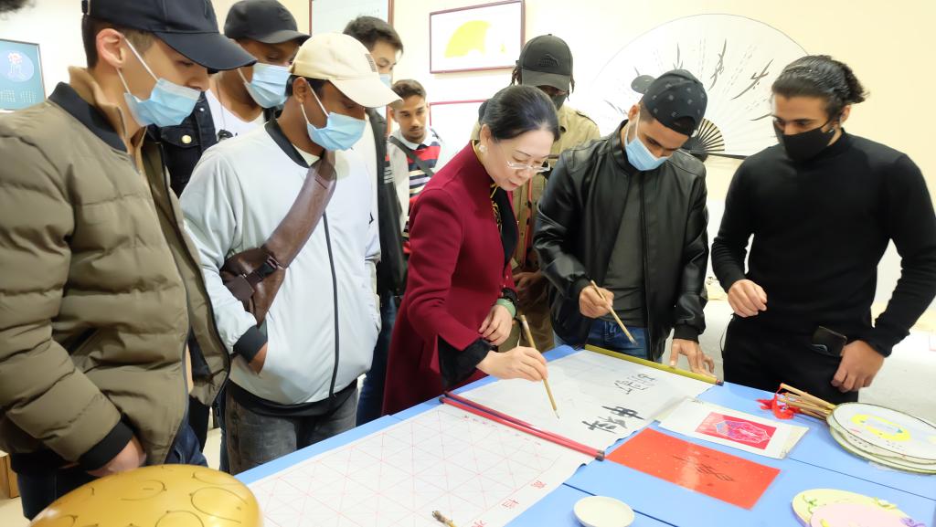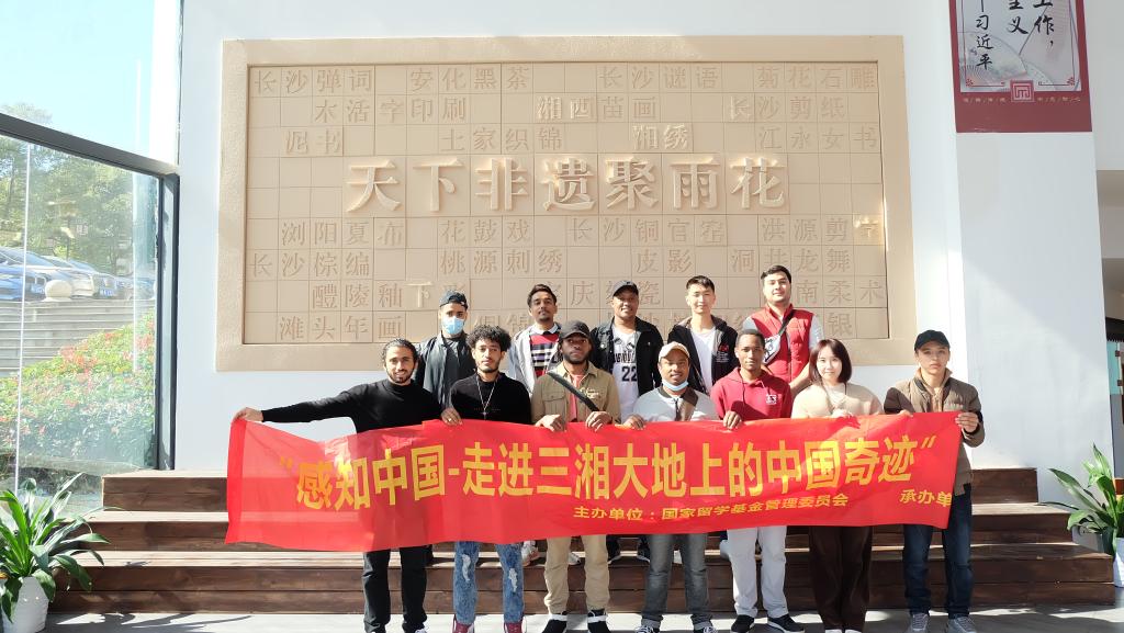 在雨花非遗馆内,精美多样的棕榈制品、栩栩如生的湘绣、逼真写实的瓷刻工艺品、活灵活现的皮影戏、典雅莹润的江永女书,一系列具有湖湘特色的非遗文创产品,让留学生们感受到“非遗”的多姿多彩。赏非遗、吃非遗、学非遗、玩非遗……与非遗文化亲密接触,让学生们大呼“过瘾”。来自也门的ABDULLAH同学在馆中爱莲女书学堂里,受到女书传人、湖南省非遗文化传承保护发展促进会副会长李爱莲“手把手”指导,用女书写下“中国”和“友好”等字,来表达对中国的热爱。来自布基纳法索的BIKINGA MANEGA说:“这里不同以往参观博物馆,只能隔着玻璃欣赏,这里的非物质文化遗产可以亲手触摸,还能动手创作,我们非常开心。”