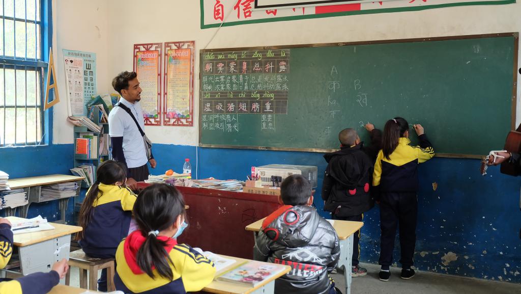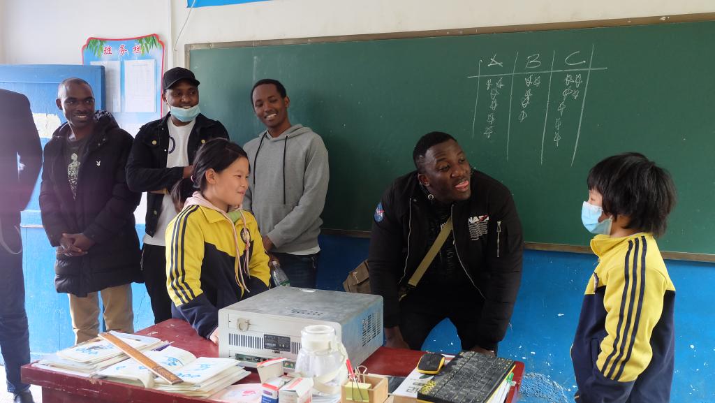 留学生们“感知中国”实践活动从关爱坪山留守儿童开始,22人的实践队分成外语组、音乐组、习俗组深入坪山小学课堂,教孩子们外语,弹唱孩子们爱听的儿歌,讲述自己国家的文化习俗。外语组留学生的课堂热闹非凡,来自不同国家的留学生们教孩子们用法语、英语、阿拉伯语、孟加拉语等多种语言说“你好”“谢谢你们”“我爱中国”等日常用语。留学生们幽默风趣的肢体语言使得初次见到异国面孔而略显拘谨的留守儿童一下子活跃了起来,简单的外语口语让孩子们学得不亦乐乎,课堂成了快乐的海洋,多元文化在这里自然碰撞,友谊在这里热情上演,梦想在这里悄然播种。课堂结束后,国际学院代表教师还给孩子们捐赠了图书,并举行了简单的捐赠仪式。