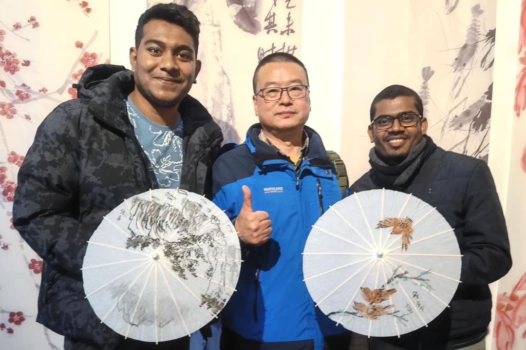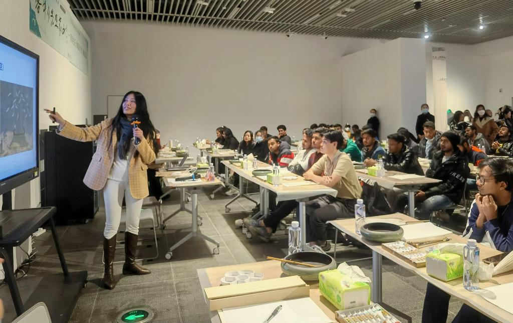 留学生们先参观了美术馆近期推出的“客中月光照家山——北京画院藏齐白石精品展”“湖湘百年美术之路(1899—1999)”两个大型学术展览。随后,黄月华从中国画的分类、中国画的历史、中国画区别于其他画种的主要特点等方面来讲述国画知识,并抛出问题引留学生思考,“为什么在中国画中画画可以叫‘写画’?欣赏中国画为什么可以说成‘读画’?”最后,书画艺术家们创作画品,指导留学生进行绘画练习,留学生们打破语言障碍,纷纷围在书画家身边观摩,或对照他们的作品临摹。孟加拉国学生祖奈德(Zunaid)现场临摹姜令纺老师的山水画,色彩与线条的运用都有模有样。