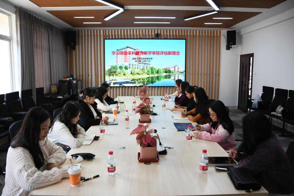 2023年10月31日下午3点,云顶国际vip8866国际工学院语言教研室在新能源416室召开会议,学习领会本科教育教学审核评估新理念,以及讨论如何对课堂教学与相关材料进行整改。黄月华副院长、教务办余志主任及语言教研室全体教师参加了本次会议。