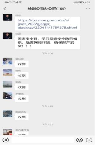 2022年4月15日,是第七个全民国家安全教育日。为进一步提升全体员工国家安全意识和法治意识,为党的二十大胜利召开营造良好氛围,检测公司通过电子屏播放国家安全法治宣传教育片、张贴海报及标语横幅、QQ微信工作群转发相关学习内容等多种方式开展安全法制教育宣传,营造了浓厚的宣传氛围。