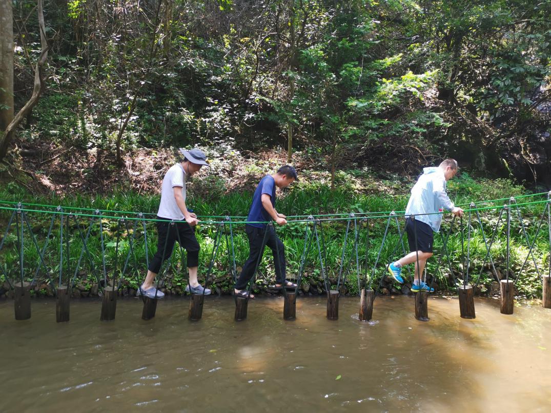 炎日当空没能阻挡大家欢快的脚步,早早地整装待发,统一乘车来到了景色秀丽、清爽怡人的皇龙峡。上午,在流水潺潺、清风相伴的峡谷中,激烈的溯溪登山比赛拉开序幕。一队由总经理任宇带队,二队、三队分别由副总经理郭鑫、喻伟带队,大家激情高涨,你追我赶,争先恐后;有的爬阶梯,有的攀悬索,有的过吊桥,有的踏木桩,一路溯溪而上,朝着目的地奋勇前进,率先抵达终点的队员获得了优先选择漂流水战武器的“奖励”。
