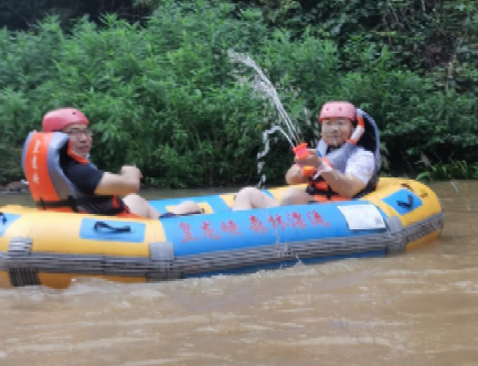 午餐后,稍憩片刻,大家迫不及待带着登山比赛的“战利品”来到了皇龙峡漂流起点,穿戴好安全帽、救生衣,两人一艇,顺流而下,迎面而来的水花与凉风冲刷了夏日的酷热,水花声、尖叫声、嬉笑声此起彼伏。在落差较大的河段,大家感受着激流带来的刺激和快感;在水流较缓的水面,激烈的泼水大战开演,水枪、水瓢、船桨尽数派上用场,在一场场戏水激战中增进了彼此友谊,提升了团结协作意识,欢声笑语久久萦绕在山谷中。