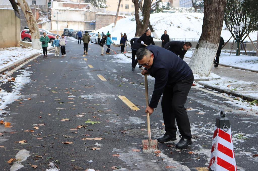 在党支部书记、总经理任宇的指挥带领下,党员、积极分子迅速响应、纷纷出动,大家不畏严寒、干劲十足,有的用铁铲除冰,有的用扫帚扫雪,手中工具不停挥舞,胸前党徽格外耀眼,忙碌的身影形成一道靓丽的风景,路过的群众纷纷驻足称赞。经过近两小时的奋战,学校西门道路及附近家属区路面、楼道出口的积雪、冰块被清扫得干干净净,大大方便了大家安全出行。