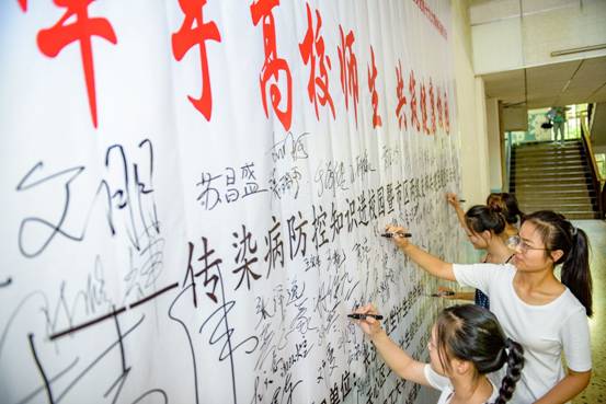 在一楼的活动现场,还设立了咨询台、宣传台,卫生监督员和党员志愿者为师生们提供现场指导,讲解传染病防治知识,并开展了百名师生签名活动,发放了2000余份宣传资料和200份爱心小礼品。