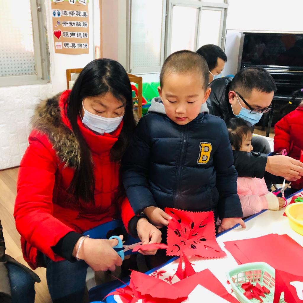 接下来的亲子游戏、亲子手工活动环节:挂灯笼、贴对联、写福字、剪窗花、做鞭炮等,家长和幼儿默契的亲子合作,提高了幼儿的动手操作能力和艺术创造力,也感受着家园携手,共庆“元旦”迎新年的欢乐情景。