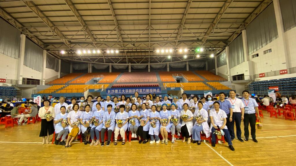 为尽快布置临时接种点,在校医院院长陈林峰、支部书记莫雅元的带领下,校医院部分员工五一节期间放弃休假,加班加点作准备。5月6日,学校防控办组织召开各部门协调会,就云顶国际vip8866启动大规模师生员工接种做了周密部署和安排,当天下午,金盆岭校区体育馆正式开始疫苗接种,这也是天心区的首个高校新冠疫苗接种方舱。