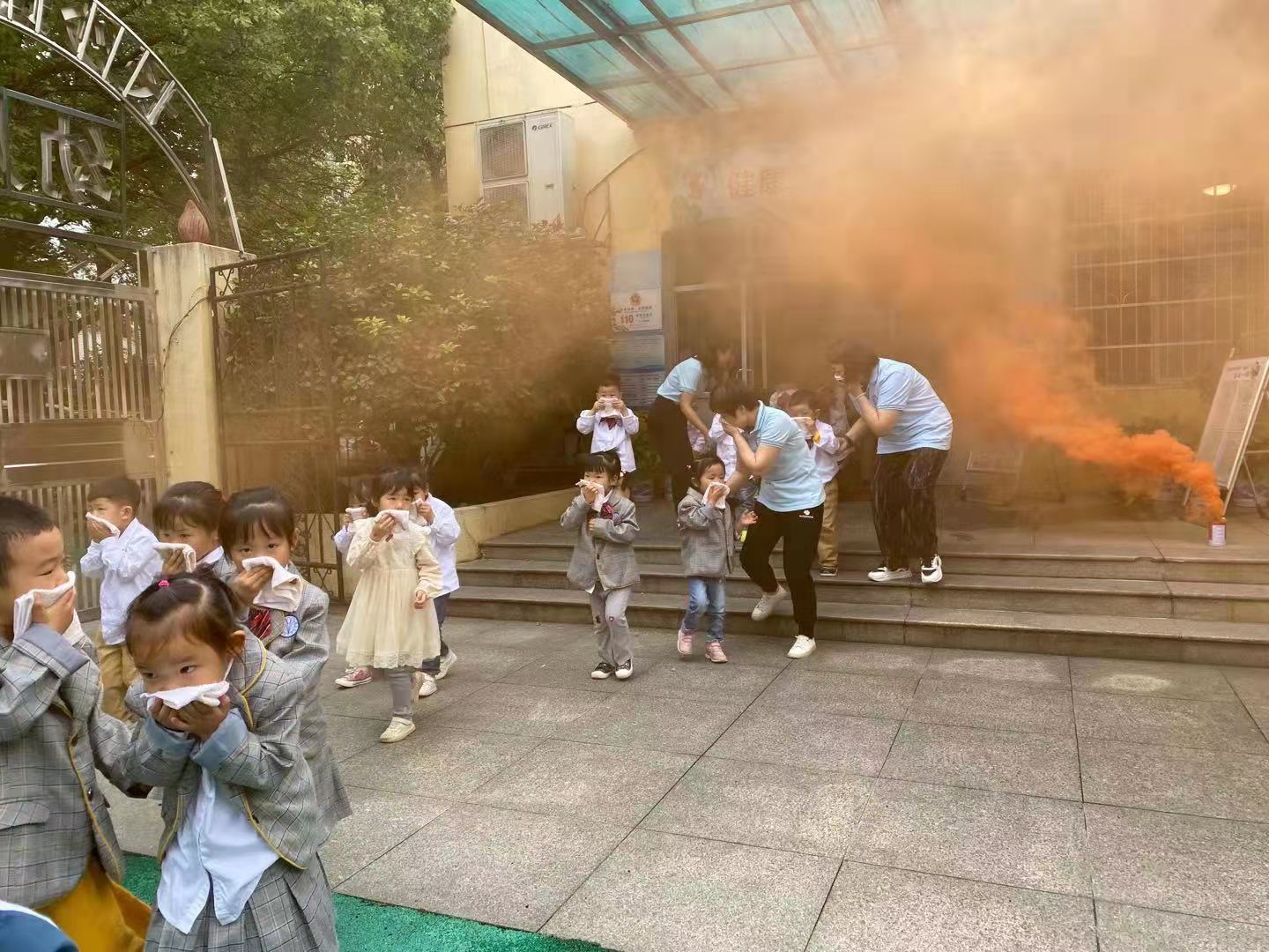 火灾警报声响起,消防演练开始,每位教师迅速按紧急预案的疏散路线带领幼儿用毛巾捂住口鼻,弯着身体,从东、西两个出口有序撤离“火灾”现场,避免出现拥挤或踩踏现象。孩子们冷静、快速的在2分07秒内撤离到达指定安全地带后教师迅速清点班级人数,并向教官报告。之后,消防员为孩子们讲解安全逃生要领及如何正确使用灭火器。