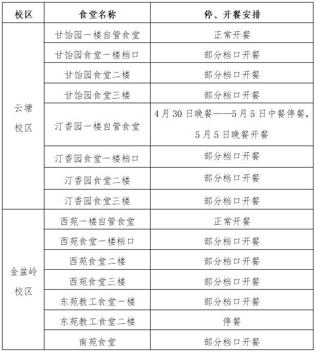 根据学校劳动节放假安排,现将假期各食堂营业时间通知如下: