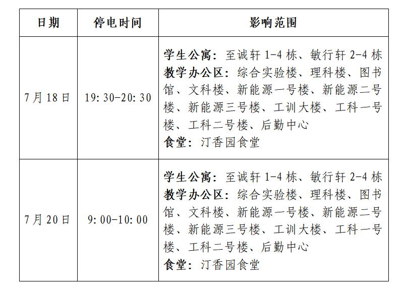 接上级通知,2025年7月19日,国网长沙电力公司将对云塘校区仙姑岭线停电进行计划检修。为保障学校的正常运行,我中心将于2025年7月18日、7月20日进行倒闸。具体停电时间及影响范围如下: