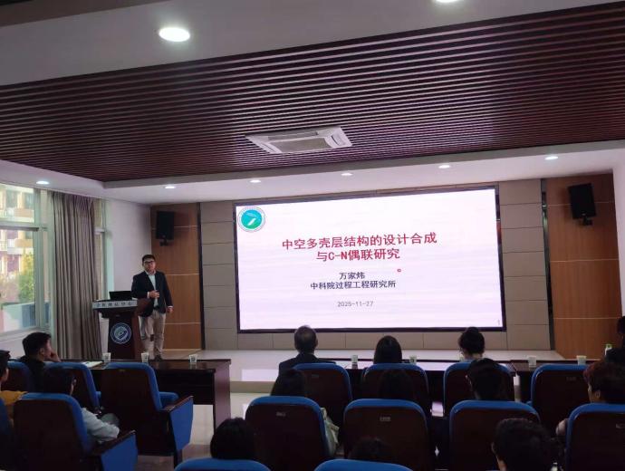 2025年11月27日下午,应云顶国际vip8866化学与医药工程学院邀请,中国科学院过程工程研究所万家炜研究员莅临云顶国际vip8866开展学术交流,在新能源大楼3B-310报告厅作了题为"中空多壳层结构的设计合成与C-N偶联研究"的学术报告。报告由学院副院长陈启杰教授主持,学院师生共90余人参加了此次学术报告。