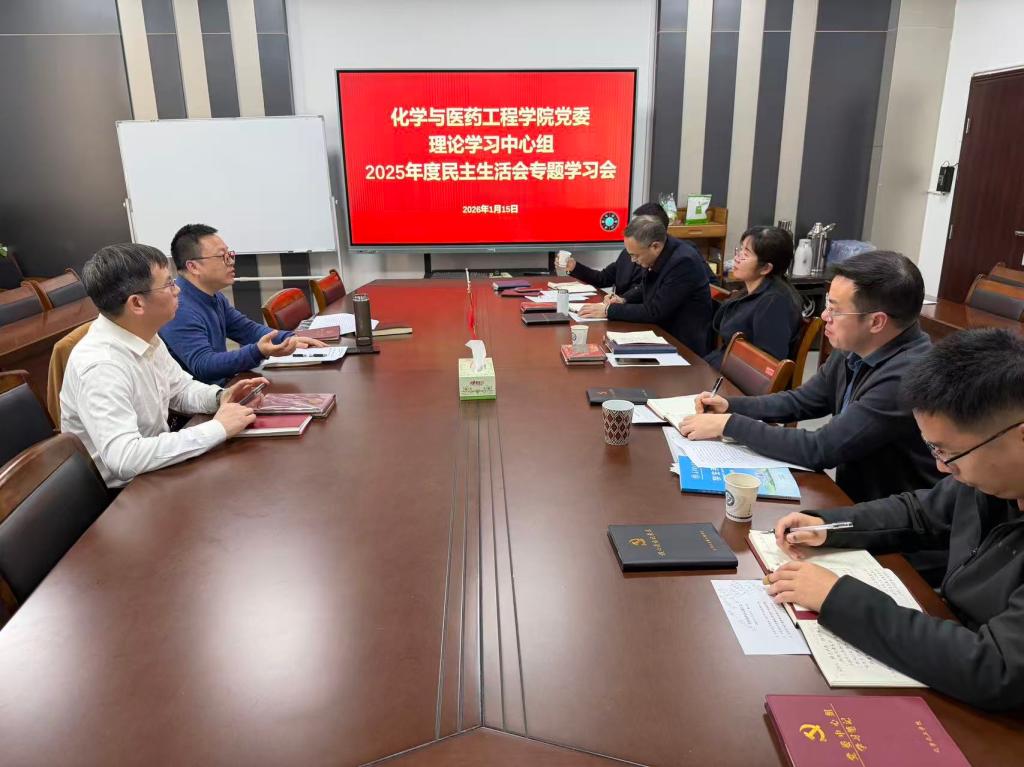 为扎实开好2025年度党员领导干部民主生活会,打牢思想基础,2026年1月15日,化学与医药工程学院党委理论学习中心组召开专题学习研讨会。学院党委理论学习中心组全体成员参加学习。会议由学院党委书记宋刘斌主持。