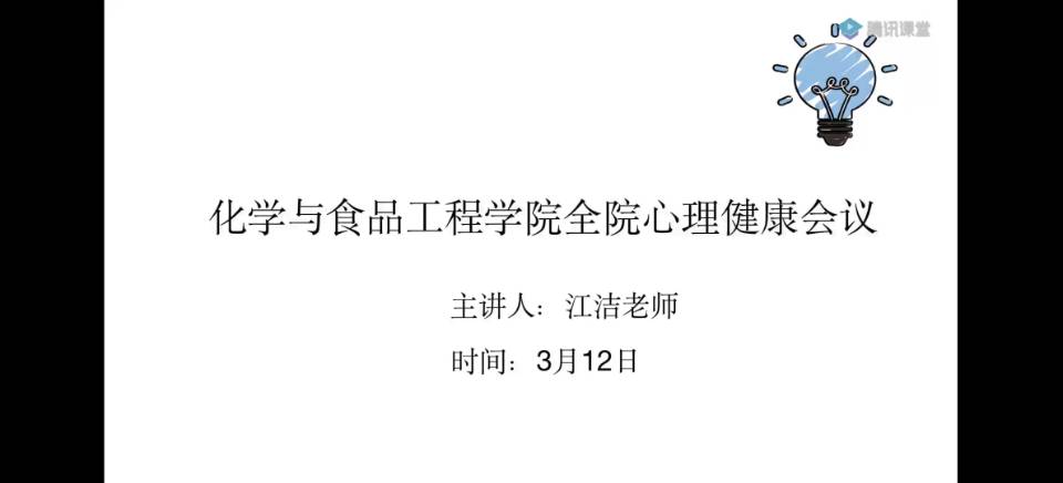 3月12日,化学与食品工程学院全院心理健康会议在腾讯课堂上开展,本次会议由心理辅导员江洁主持,参会人员有各级心理委员及幸福舍、心理部全体成员共计70人。