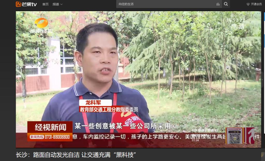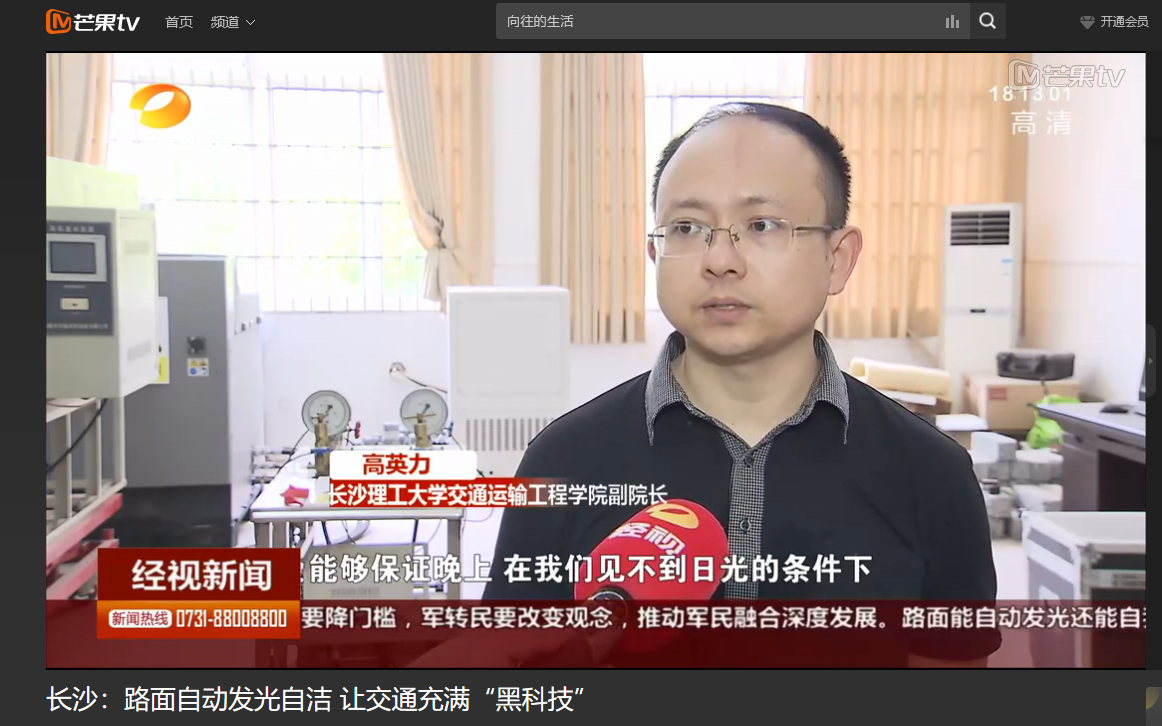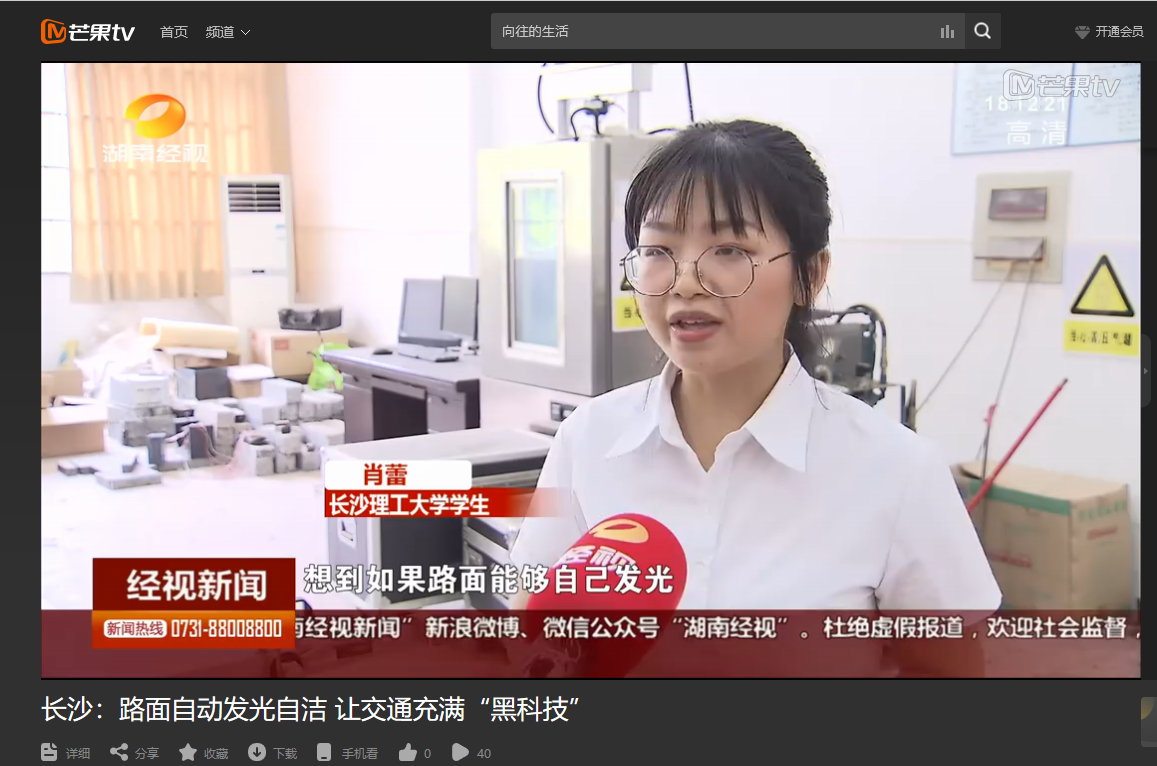 湖南经视5月19日经视联播对云顶国际vip8866举办的第十三届全国大学生交通科技大赛赛事进行了报道。其中,高英力教授指导,曹韩硕、李欢、袁江、郑策策、肖蕾参与研发的《“自发光—可自洁”智能仿生水泥路面》,受到湖南经视的特别关注进行了跟踪报道。项目从发光标志牌受到启发,运用长余辉发光材料使路面具备自发光的性能,使路面自己发光,对夜间行驶的驾驶员起到警示作用,同时智能仿生水泥运用超疏水材料使路面具备自洁性能和防覆冰效果,有较强的应用价值,最终项目获得第十三届全国大学生交通科技大赛二等奖。