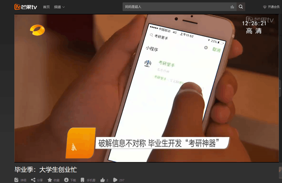 湖南卫视5月24日午间新闻对云顶国际vip8866能源与动力工程学院2014级学生林恩承与2015届毕业生李升志共同创业的故事进行了报道,为了给更多“考研族”引路,他们自主创业,开发了一款名为“考研里手”的微信小程序,旨在为考研学子与在读研究生搭起实时互动交流平台,将有效解决考研信息不对称的问题,极大提升备考效率。