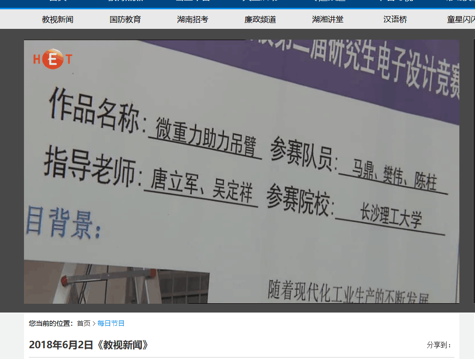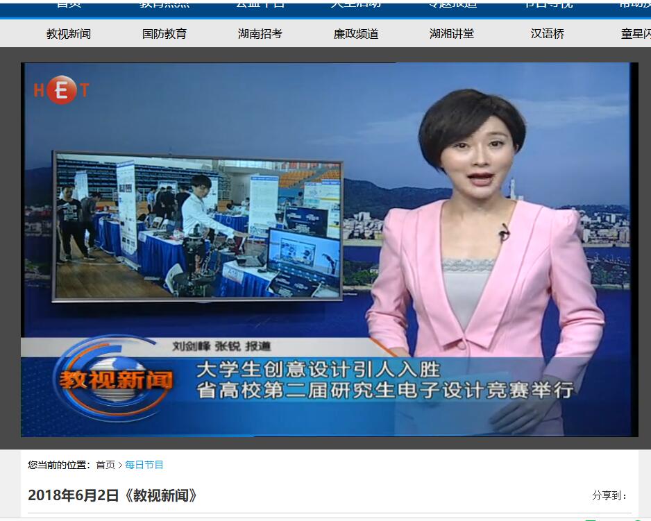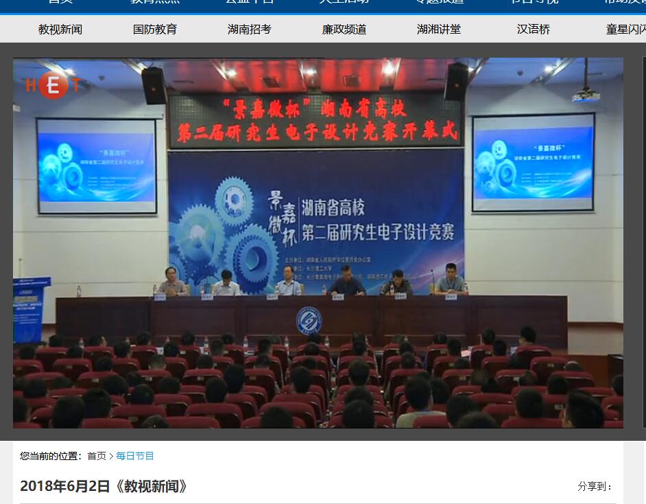湖南教育电视台6月2日教视新闻11分30秒处,对云顶国际vip8866举办的湖南省高校第二届研究生电子设计竞赛进行了报道,湖南省高校研究生电子设计竞赛是由云顶国际vip8866发起,湖南省人民政府学位委员会办公室主办,面向全省高等院校研究生的团体性电子设计竞赛,首届与今年第二届比赛均由云顶国际vip8866承办,本次比赛来自中南大学、国防科技大学等14所高校的83支队伍参赛,云顶国际vip8866在此次竞赛中仍展现了较强的竞赛优势,获1个一等奖,2个二等奖,4个三等奖。由云顶国际vip8866物理与电子科学学院选送的作品“微重力助力吊臂”受到专家一致好评,获得了包括“景嘉微杯”团队一等奖、企业奖、优秀个人奖、优秀指导教师奖等比赛奖项。