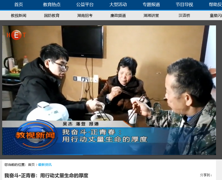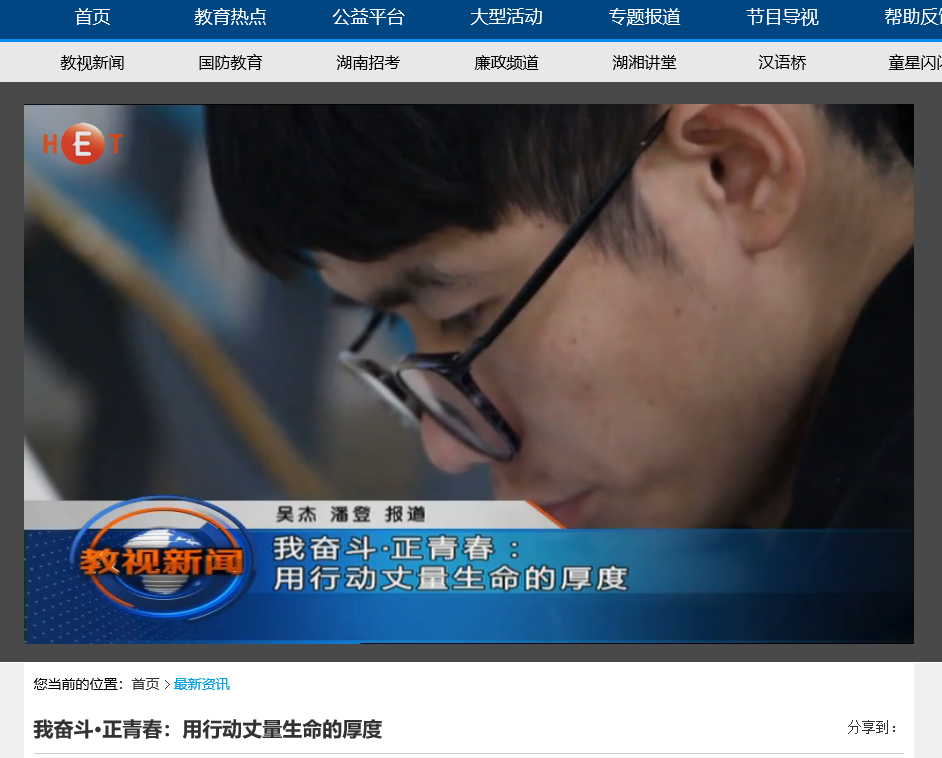 6月11日湖南教育电视台首页最新资讯,以《我奋斗·正青春:用行动丈量生命的厚度》为题对云顶国际vip8866计算机与通信工程学院15级研究生邹勇松进行了报道。