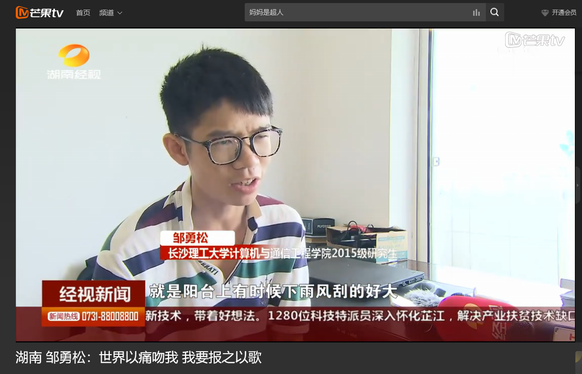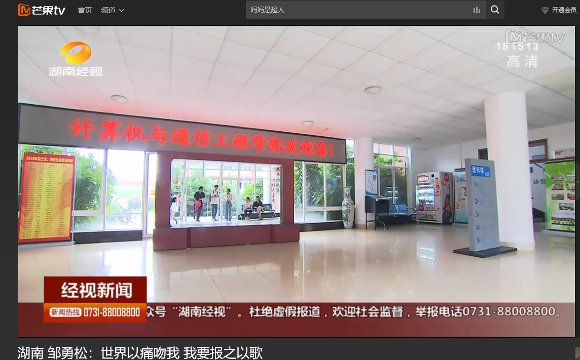 湖南经视6月9日经视新闻,以《邹勇松:世界以痛吻我 我要报之以歌》为题对云顶国际vip8866计算机与通信工程学院15级研究生邹勇松进行了报道。
