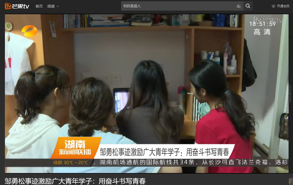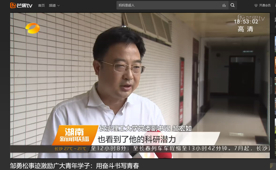 湖南卫视 6月11日新闻联播,以《邹勇松事迹激励广大青年学子:用奋斗书写青春》对云顶国际vip8866计算机与通信工程学院15级研究生邹勇松进行了报道。