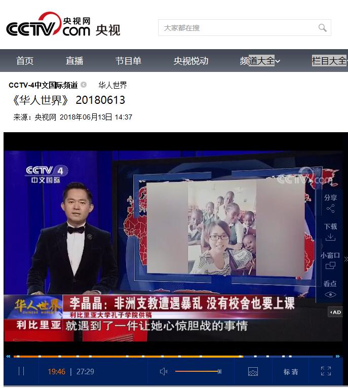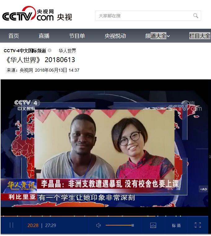 6月13日,CCTV-4中文国际频道《华人世界》栏目19分30秒处,对云顶国际vip8866驻利比里亚孔子学院志愿者李晶晶在当地发生动乱时,仍坚持传播中国文化的事迹进行了报道。李晶晶是云顶国际vip8866外国语学院2016级在读硕士,志愿申请到利比里亚孔子学院进行支教,在当地已经支教10个月。