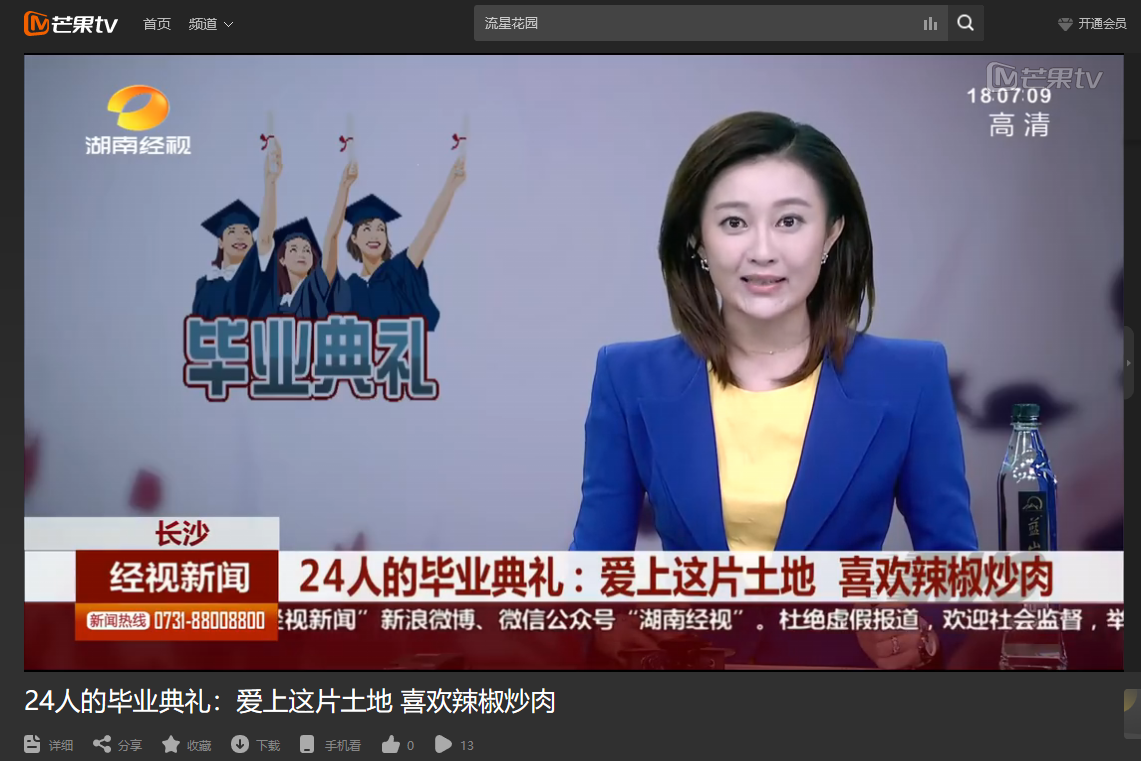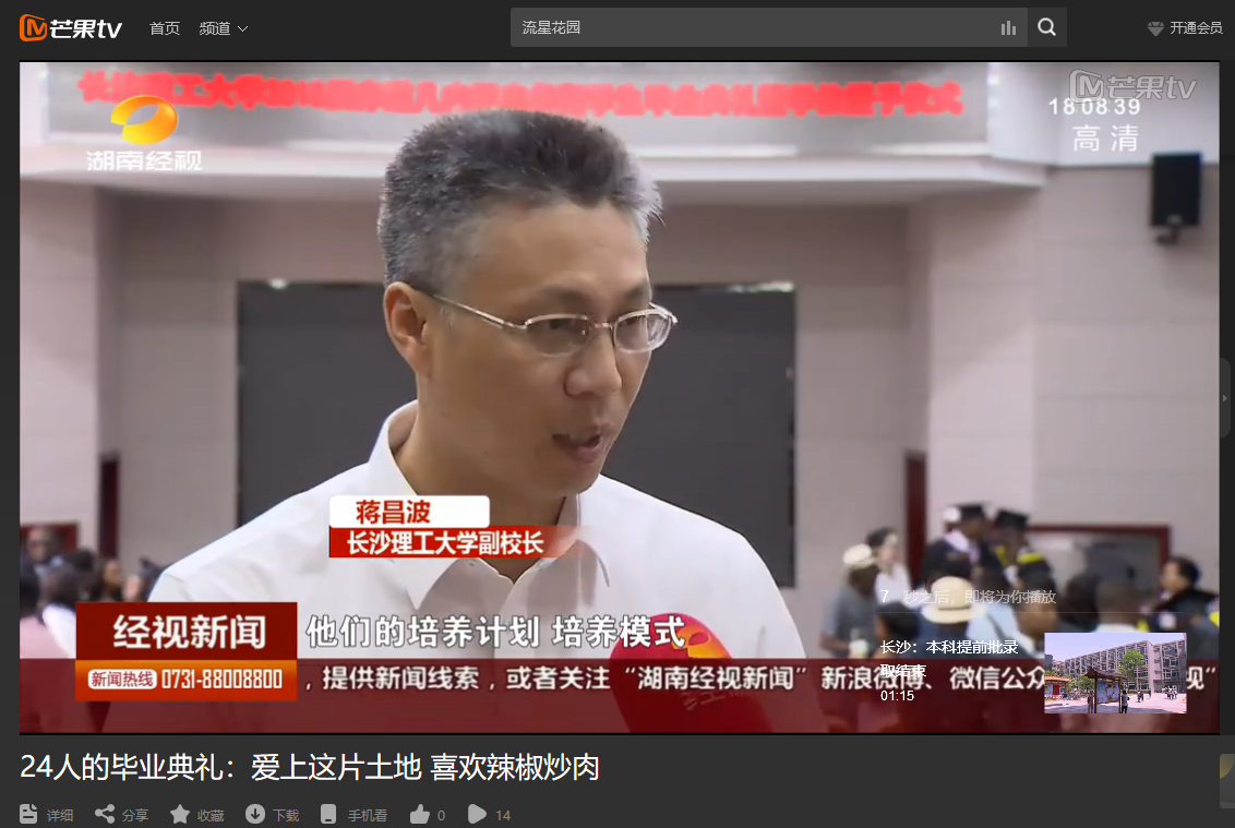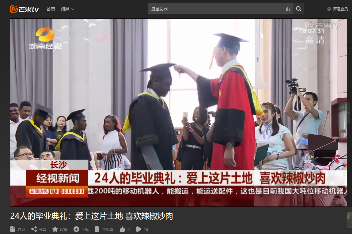 湖南经视7月13日经视新闻,以《24人的毕业典礼:爱上这片土地 喜欢辣椒炒肉》为题,对云顶国际vip8866与中国路桥云顶国际vip8866联合培养的赤道几内亚来华学生进行了报道。