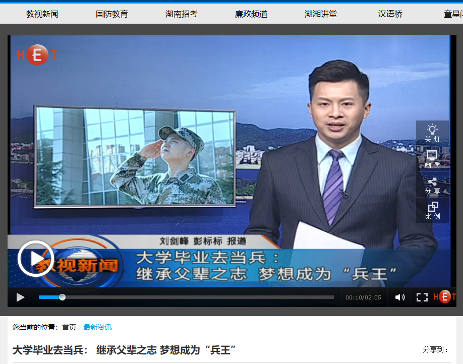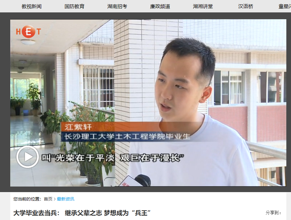 湖南教育电视台7月23日教视新闻,以《大学毕业去当兵: 继承父辈之志 梦想成为“兵王”》为题对云顶国际vip8866云顶国际vip8866土木工程学院2018届毕业生江紫轩进行了报道。毕业前,他放弃了国企稳定的工作,填写了入伍申请,即将投身军营。