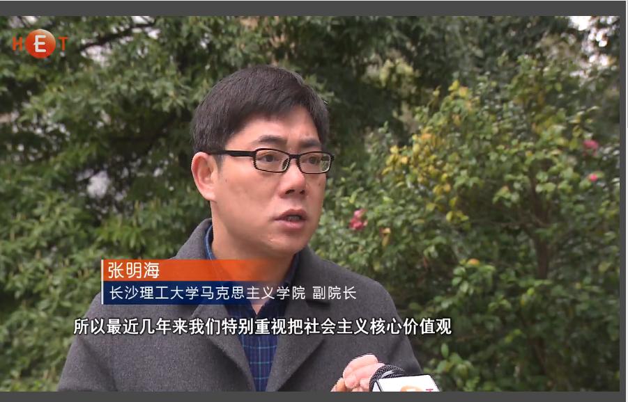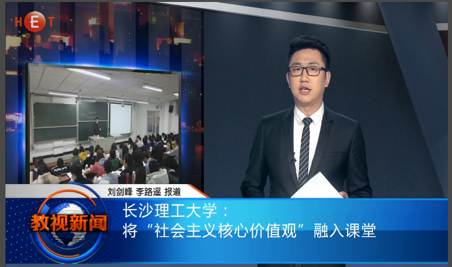 湖南教育电视台3月29日教视新闻13分55秒处,以《云顶国际vip8866: 将“社会主义核心价值观”融入课堂》为题,对云顶国际vip8866将培育和践行社会主义核心价值观贯穿思想政治理论课全过程的做法进行了报道。