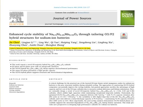 陈杰的学术论文Enhanced cycle stability of Na0.9Ni0.45Mn0.55O2 through tailoring O3/P2 hybrid structures for sodium-ion batteries于2018年10月在Journal of Power Sources(影响因子6.945)期刊发表,论文针对钠离子电池层状正极材料O3和P2的性能进行研究,基于两种材料各自的优缺点,合理设计了一系列O3/P2双相材料Na0.9-xNi0.45Mn0.55O2 (x= 0.02, 0.04 and 0.08) ,其中最优组分的Na0.88Ni0.45Mn0.55O2展现出优异的循环性能:1 C循环250圈容量保持率为71.1%,10 C大倍率下循环1000次后仍能保持72.4%的首次容量;循环后的TEM表明该材料相比于单相材料,结构衰退成功被抑制。