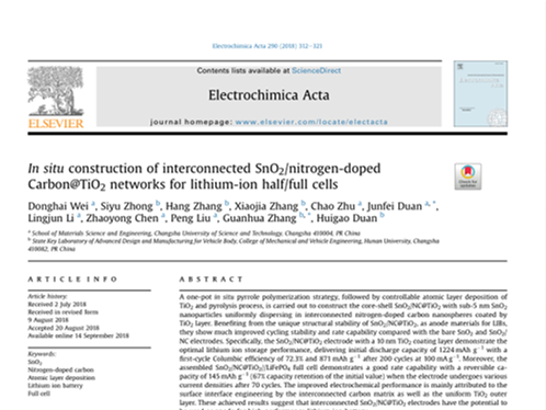 魏东海的学术论文In situ construction of interconnected SnO2 /nitrogen-doped Carbon@TiO2 networks for lithium-ion half/full cells于2018年9月在Electrocardiogram Acta(影响因子5.116)期刊发表,论文针对二氧化锡基锂离子电池负极材料的储锂性能,二氧化锡作为锂离子电池负极材料时,充放电过程中引起比较大的体积膨胀,导致循环性能不好。论文针对这一问题,通过制备纳米复合材料,对此进行优化,获得了良好的电化学性能。