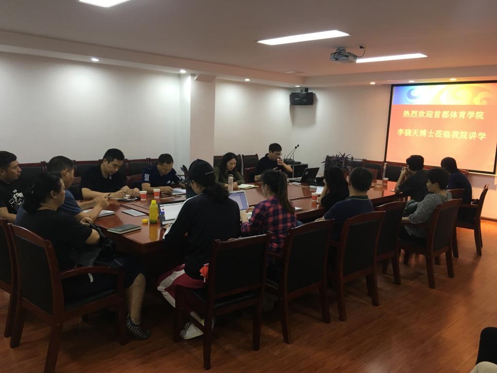 6月13日,首都体育学院体育大数据与智能研究院院长李骁天应邀来校,在金盆岭体育馆会议室为体育学院教师作学术讲座,院长张恳、党总支书记章罗庚,副院长潘红玲、李龙及学院30余名教师参加,讲座由潘红玲主持。