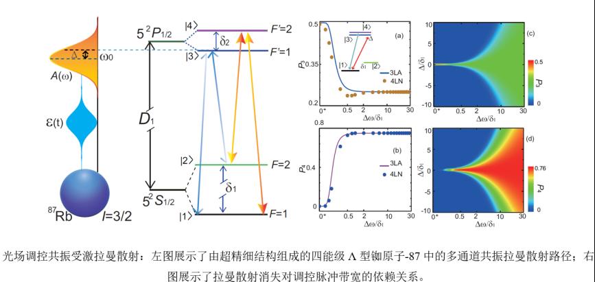 该论文理论研究了光场诱导超低温铷原子-87超精细能级间的多通道共振拉曼散射问题。以典型的四能级双Λ型系统为例,展示了两个不同路径跃迁的共振拉曼散射过程可在宽带脉冲激发区域出现自然消失现象,并且这种反直觉的物理现象可以利用相干光学相位调制技术进行调控,从而重现超精细能级间的共振拉曼散射现象。论文分析了该理论结果在超冷碱金属原子中实现的实验可行性,和在量子超导、金刚石色心等固态人造原子中的应用前景。该研究成果不仅加深了理解量子干涉调控非线性光学效应的内在机理,而且理论拓展了超冷原子和受激拉曼光谱学的研究问题。