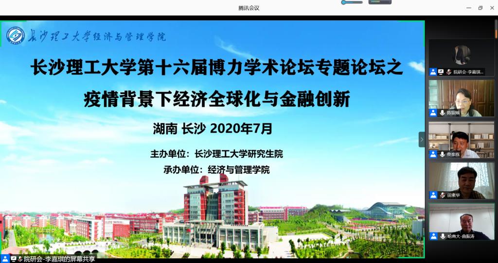 7月5日上午,第十六届研究生博力学术论坛正式开幕,本次论坛设置了专题论坛 ——“疫情背景下经济全球化与金融创新”,由经济与管理学院与外国语学院联合承办,采用腾讯会议方式在线举行。副校长谈传生,研究生院、人文社科处,经管学院、外语学院等相关部门和学院领导出席开幕式。本次论坛还吸引了来自复旦大学、中南财经政法大学、河北经贸大学等高校以及云顶国际vip8866经管、外语、艺术、化学等学院教师、研究生近300人在线参加。论坛开幕式由经管学院院长陈银娥教授主持。
