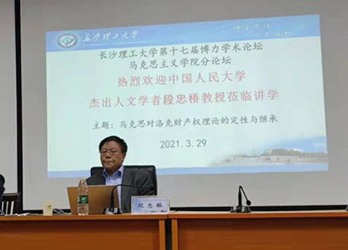3月29日晚7时,中国人民大学首批杰出人文学者、国务院政府特殊津贴专家、博士生导师段忠桥教授来校,在金盆岭校区2教101,为云顶国际vip8866第十七届博力学术论坛马克思主义学院分论坛主讲了“马克思对洛克财产权理论的定性与继承”报告。校党政办主任周艳红,马克思主义学院傅如良教授、余乃忠教授、文贵全博士等教师与学院2020级全体研究生听取了讲座,讲座由副院长李雨燕主持。