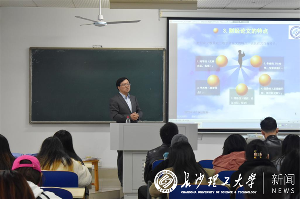 刘建民通过财经论文概述、财经论文选题、财经论文写作三部分开启了本次授课,他以“秧好一半谷,妻好一半福,题好一半文”的古语为引阐述选题的重要性,他指出选题要围绕“有意义、有兴趣、有准备、有基础、有创新”等五个方面入手。他强调论文写作基本原理相通,细致阐述了选定题目、文献搜集、草拟提纲、撰写初稿、论文修改和定稿投稿等六个完整环节的注意事项,勉励同学们在论文写作中要结合中国国情、寻找学科交叉点、做好文献搜集、敢于发现和解决问题,从而在论文写作中实现题目“养眼”,框架“养心”,内容“养脑”。刘建民通过领学党的二十大报告,引导同学们加深对党的创新理论成果的领悟和理解,勉励未来的新闻从业者们主动增强政治素养,用手中的笔书写时代华章。