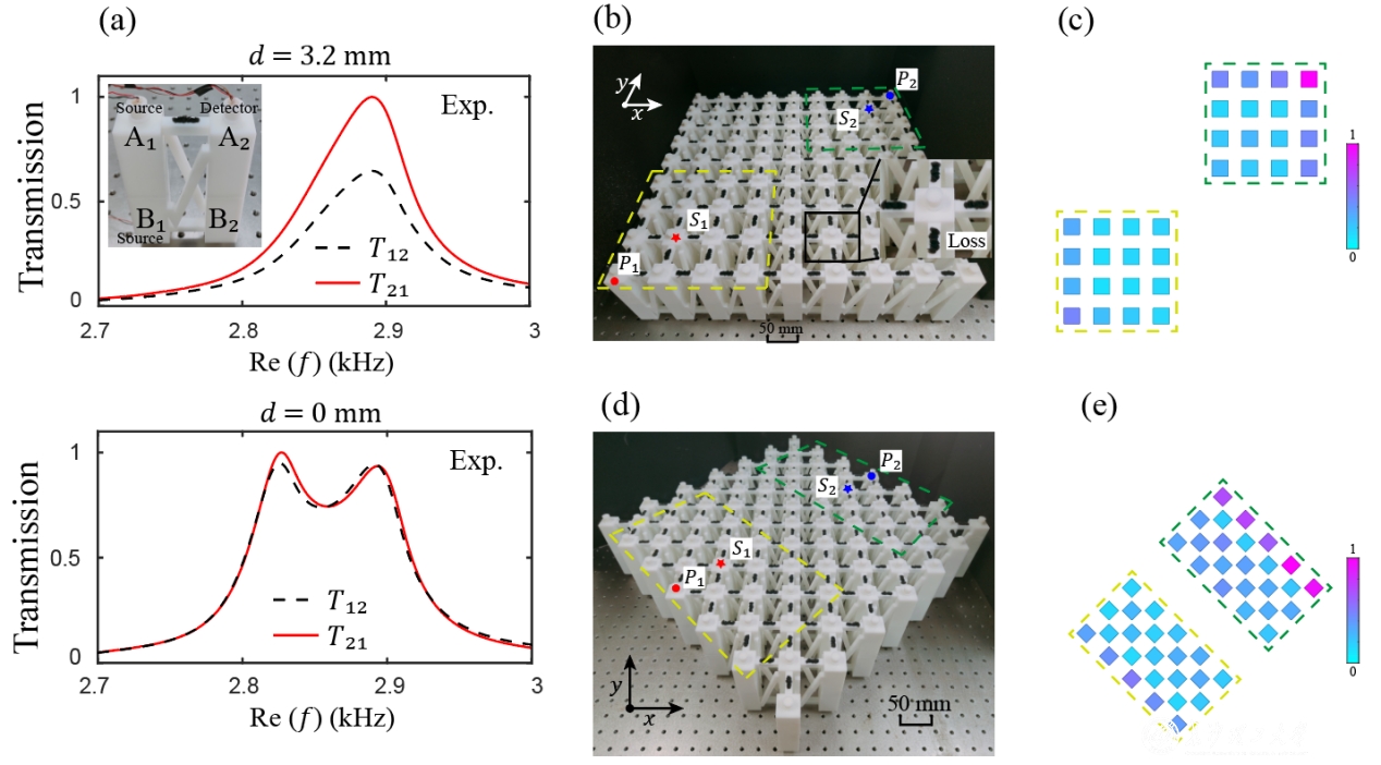 图1.二维声子晶体中混合阶趋肤效应的实验观测。(a)损耗诱导的非互易传输观测。(b)正方形声子晶体样品。