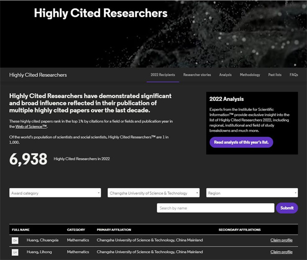 On November 15, 2022, Clarivate revealed its 2022 List of Global Highly Cited Researchers. Two scholars of Changsha University of Science and Technology, Professor Huang Chuangxia and Professor Huang Lihong, are among the list.
