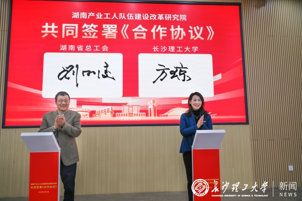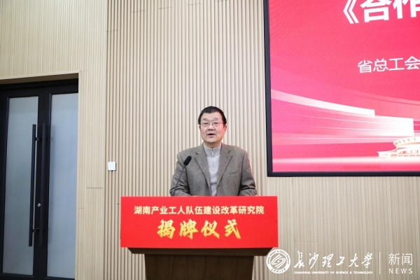 付宏渊对省总工会长期以来给予学校建设发展的关心支持表示感谢,他指出,党的二十届三中全会强调要“着力培养造就卓越工程师、大国工匠、高技能人才,提高各类人才素质,建设一流产业技术工人队伍”。高校作为教育、科技、人才的集中交汇点,既是人才培养的摇篮,也是科技创新的重镇,必须责无旁贷。此次省总工会与学校共建湖南产业工人队伍建设改革研究院,是省总工会探索产业工人队伍建设改革的又一创举,也是学校进一步服务湖南经济社会发展的又一重要平台。学校将充分发挥学科、人才、技术、平台等资源优势,聚焦新时代产业工人培养体系完善等热点难点问题深入开展理论研究、智库服务等,为深化产业工人队伍建设改革、探索形成湖南经验,实现“三高四新”美好蓝图贡献“长理智慧”和“长理力量”。