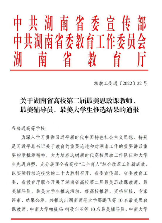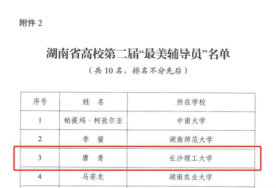 近日,湖南省教育厅公布了湖南省高校第二届最美辅导员、最美大学生推选结果,经管学院党委副书记唐青获评湖南省“最美辅导员”。