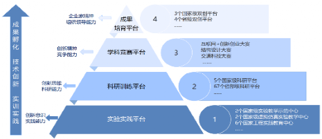 2、以赛促教、以赛促学、以赛促创,创建多维度创新实践体系。学校坚持把学科竞赛作为提高学生实践能力、创新能力的“常态化”抓手,完善校级、省级、国家级三级学科竞赛体系,大力推进创新创业训练计划,鼓励毕业论文从科研和企业实践选题(超过90%),为学生搭建各类实践创新平台,深化校、企、地多元协同,建设开放共享的实验实践、科研训练、学科竞赛、双创成果培育等平台(图1),组建现代产业学院和产业联盟,形成“实训实践—技术创新—成果孵化”全链条服务载体,实现学生参与双创实践全覆盖。以“思创融合”为引领,开设双创通识课66门;拓展专业核心课程,打造专创融合课207门;依托主要双创赛事,遵循探究式、体验式学习理念,创建赛教结合课44门。