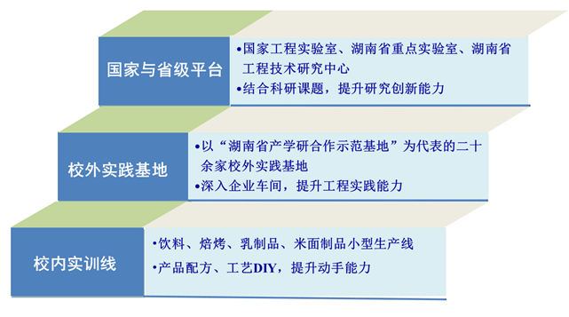 在金健米业、克明面业、青岛啤酒等十多家上市公司与国家龙头企业建立了稳定校外实习与产学研基地,2013年与湖南金健米业共同申报并立项“粮油及副产物深加工湖南省研究生培养创新基地”,2014年与大湖水殖合作申报并立项“湖南水生资源食品加工工程技术研究中心”、与湖南粒粒珍湘莲有限公司合作申报并立项“湘莲深加工湖南省高校产学研合作示范基地”,打造出优质校企协同工程实践平台。