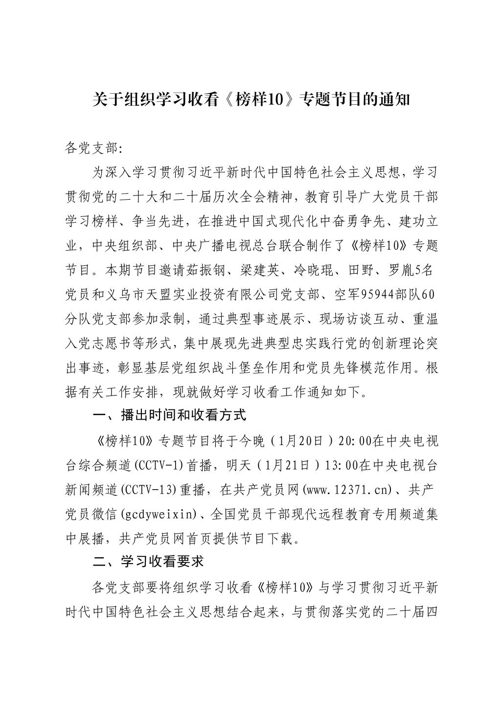 关于组织学习收看《榜样10》专题节目的通知